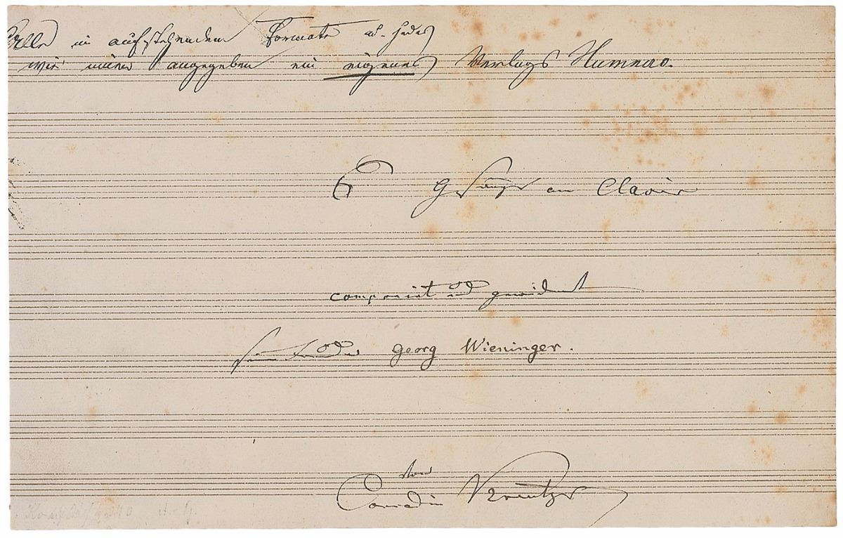 German composer and conductor (1780–1849) best remembered for his romantic opera Das Nachtlager in Granada. Ink signature and inscription in German (translated), “6 Songs on the Piano, composed and dedicated to his friend Georg Wieninger, from Conradin Kreutzer,” on an off-white 10.5 x 6.75 musically lined sheet removed from the title page of a longer manuscript. Also bears a note in another hand across the top. In very good condition, with moderate overall foxing and trimmed edges.