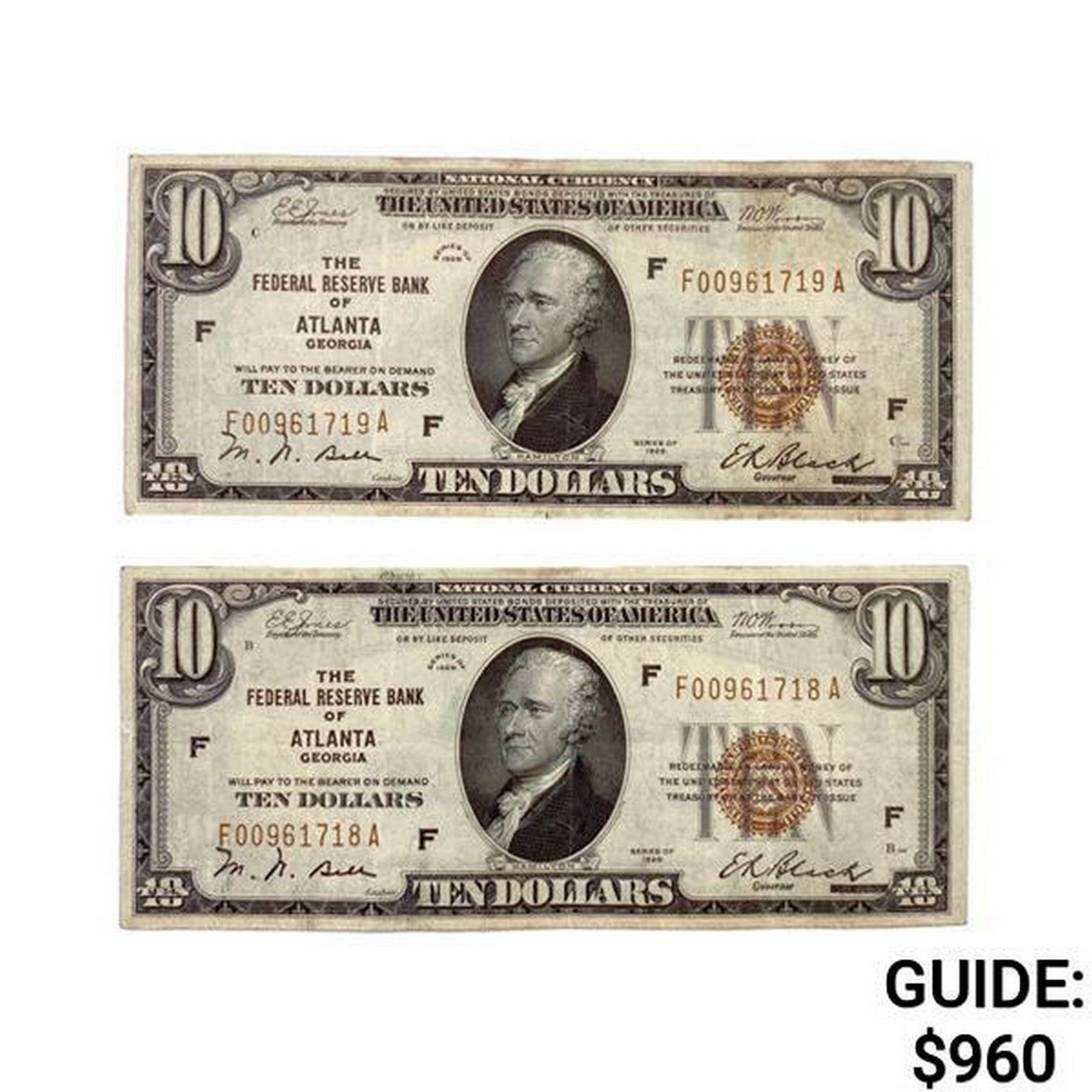 Consec 1929 F US Bank of Atlanta, GA $10 Fed Res