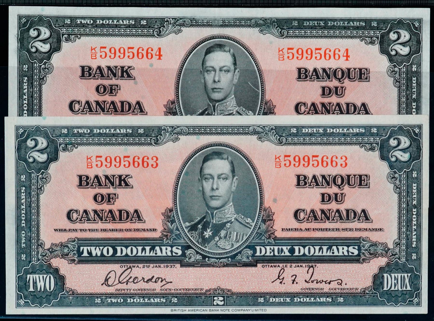 Consecutive Pair; 1937 $2 BC-22b #K/B5995663-5664, Both notes AU, Pressed.