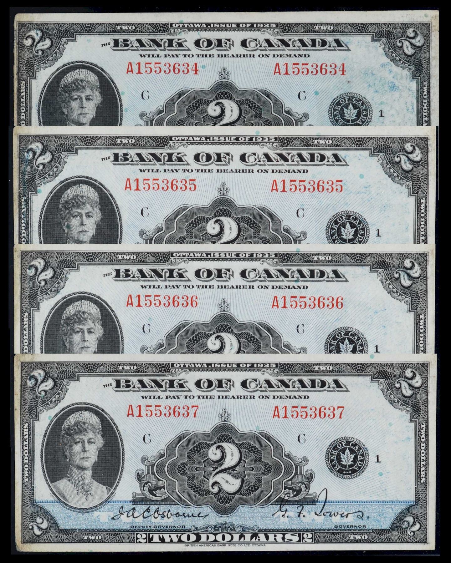 Consecutive Run; 1935 $2 BC-3 #A1553634-637 BCS About Uncirculated-50 with issues. Lot of 4 consecutive notes. Cat. Value: $6600. Rarely seen and offered. A "Cool" set!