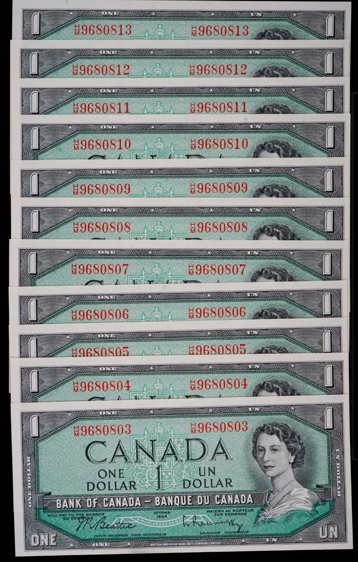 Consecutive run; 1954 $1 BC-37b-i #H/M9680801813 All Unc to choice Unc. Lot of 11 consecutive notes of this better prefix.
