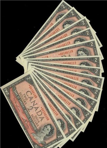 Consecutive run of 14 1954 $2 replacement notes. BC-38dA *O/G0166109 to 6122. All Gem uncirculated. Scarce!