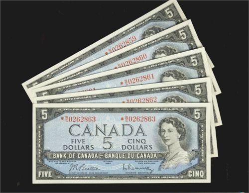 Consecutive run of 5 BC-39bA $5 replacement *W/S notes. 0262859 to 2863. All five notes are original choice uncirculated. Rare prefix note!