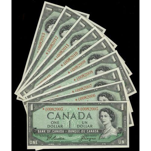 Consecutive run of 9 BC-37aA 1954 $1 Beattie-Coyne *0082005 to 2013. All choice uncirculated. Scarce and underrated replacement note.