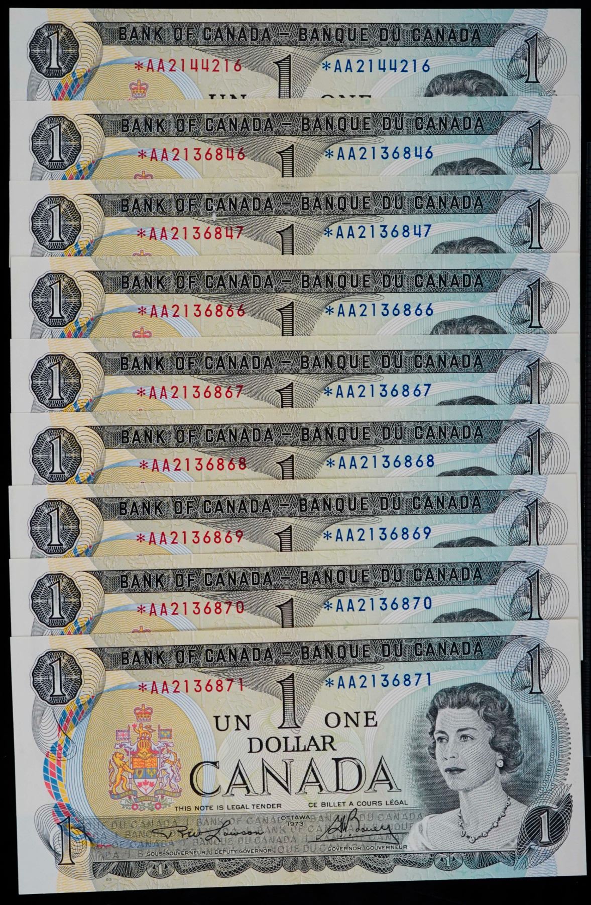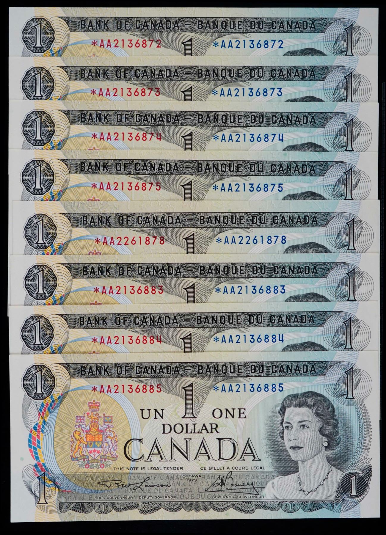 Consecutive runs; 1973 $1 BC-46aA *AA, Lot of 17 notes Unc to Gem Unc, several runs.