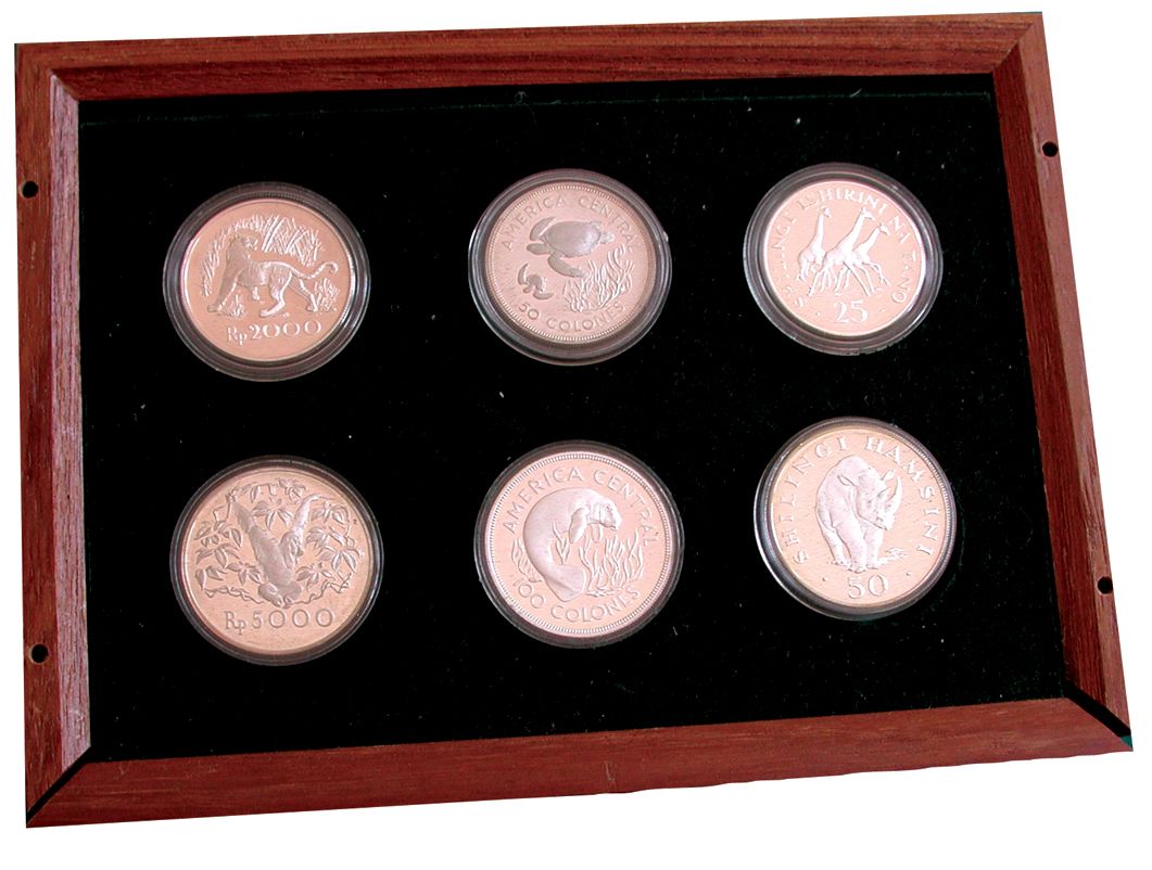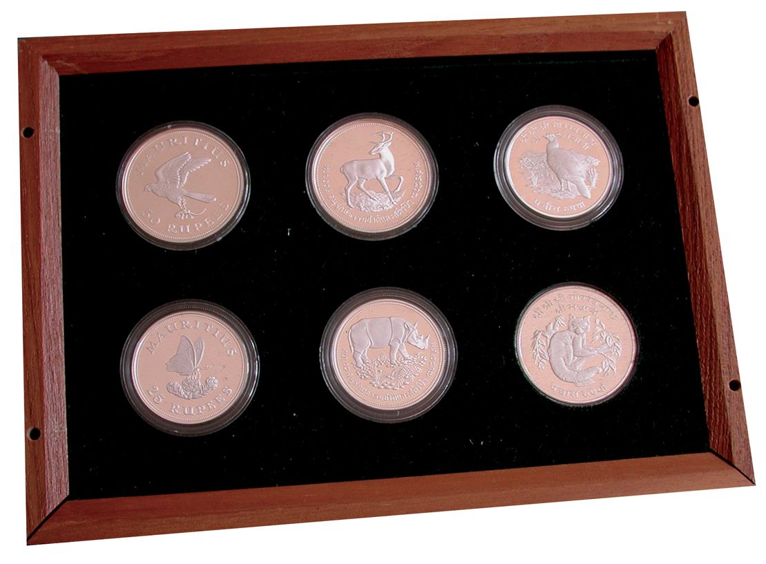 Comprises 2 Sterling Silver Proofs from each of these countries: Costa Rica, Nepal, Tanzania, Indonesia, Thailand and Mauritius. In wooden cabinet of issue FDC