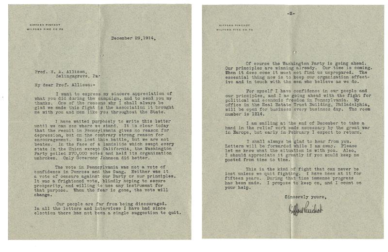 GIFFORD PINCHOT. TLS. 2pp. 7" x 9". Milford Pike Co. Pa. December 29, 1914. A typed letter signed "Gifford Pinchot" to "Prof. H.A. Allison": "I want to express my sincere appreciation of what you did during the campaign...One of the reasons why I shall always be glad we made this fight is the association it brought me with you and men like you throughout the State...We lost this battle, but we are not beaten. In the face of a landslide which swept away every state in the Union except California, the Washington Party polled 270,000 votes and held its organization unbroken...I am sailing at the end of December to take a hand in the relief work made necesary by the great war in Europe..." The letter is in very fine condition despite a minor pinhole that affects nothing.