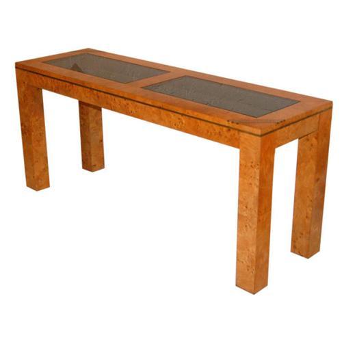 Description: Console in the style of Milo Baughman. Burlwood or olive wood with inset brass, smoked glass, Lane label.