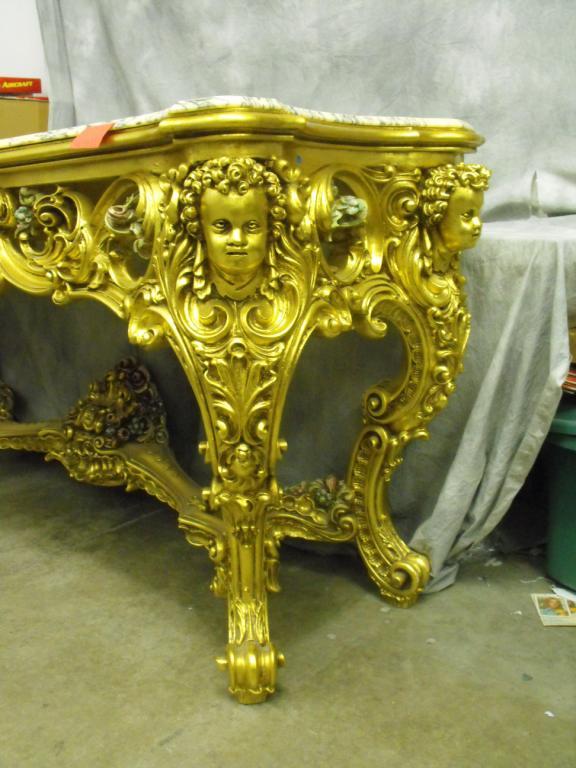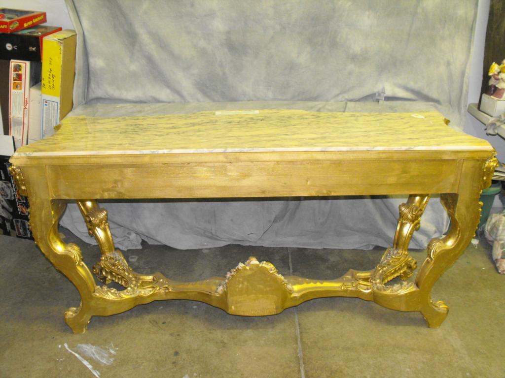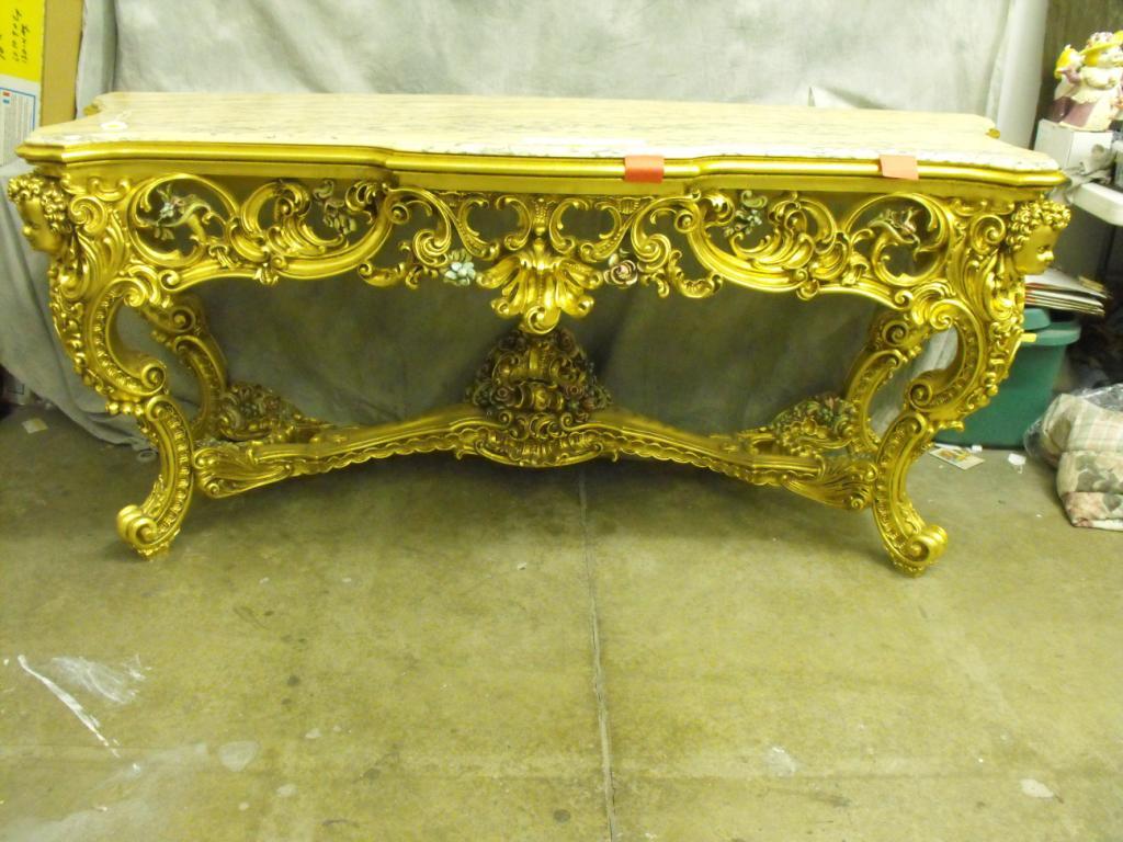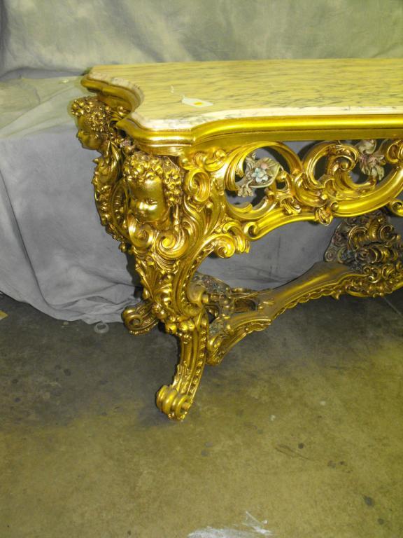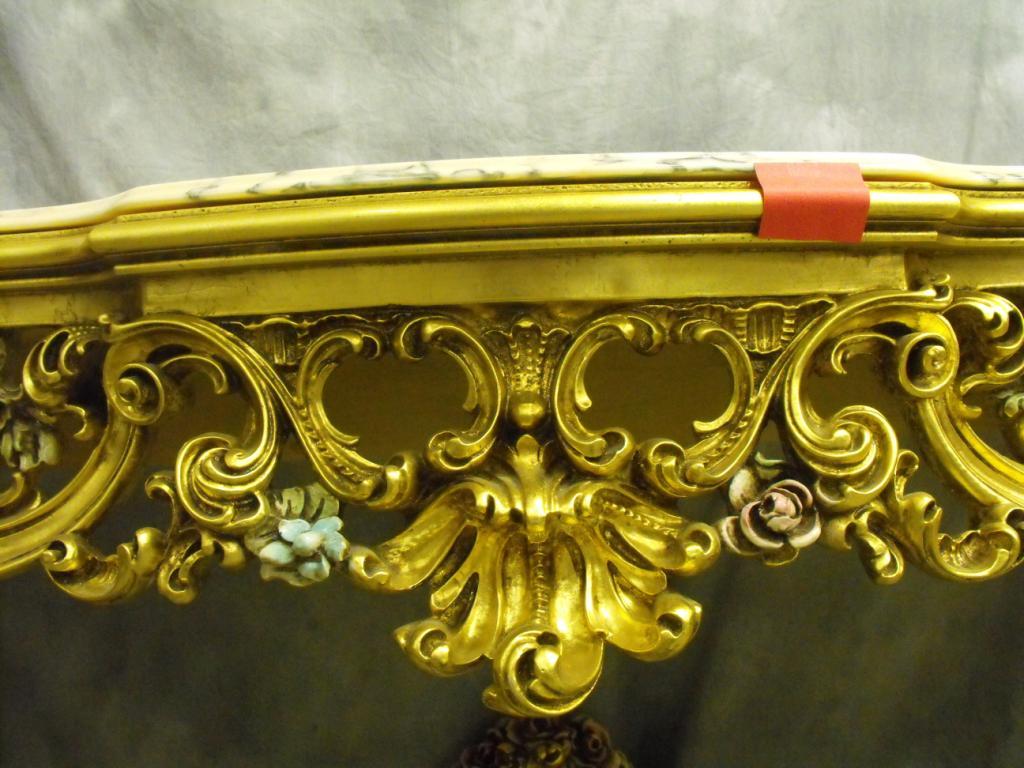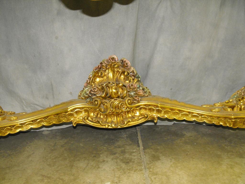 Louis XIV Gilt Wood Console, Italian Marble Top WIth Molded Serpantine Edge, Apron Carved with large Sweeping Wave Like Acanthus Leaves with Swirling C-Scroll Volutes Centered with Massive Scrolled Acanthus Leaf Hand Painted Pink and Green