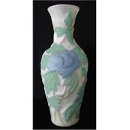 Produced by Consolidated Art Glass this beautiful vase features pastel blue peony flowers with green leaves & vines over gorgeous milk white glass. Measuring about 9 1/2" tall this exquisite Art Glass Vase is in excellent condition.