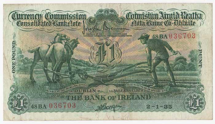 Consolidated Banknote, "Ploughman". Bank of Ireland. One Pound. 2-1-35