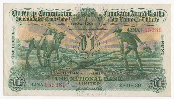 Consolidated Banknote, "Ploughman". National Bank. One Pound. 2-9-39