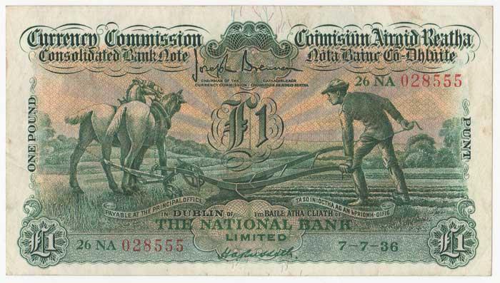 Consolidated Banknote, "Ploughman". National Bank. One Pound. 7-7-36