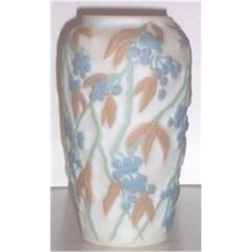 This gorgeous Consolidated Art Glass 10" vase features the Bittersweet pattern in soft shades of blue, green, and tan against a milk glass background, with all the details in high relief. This vase is quite heavy, and the dimensions are 5in. in rim diameter by 10in. tall It is in excellent condition, including the original Consolidated Glass sticker on the bottom with production numbers visible