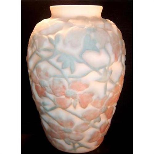 This gorgeous Consolidated Art Glass vase features a cameo glass flowers and vines pattern in soft pastel shades of green, and pink against a custard glass background. This vase is quite heavy, measures 11 inches tall x 3 3/4 inch in rim x 4 inch base - and, with the exception of a small chip below the rim, is in excellent condition.