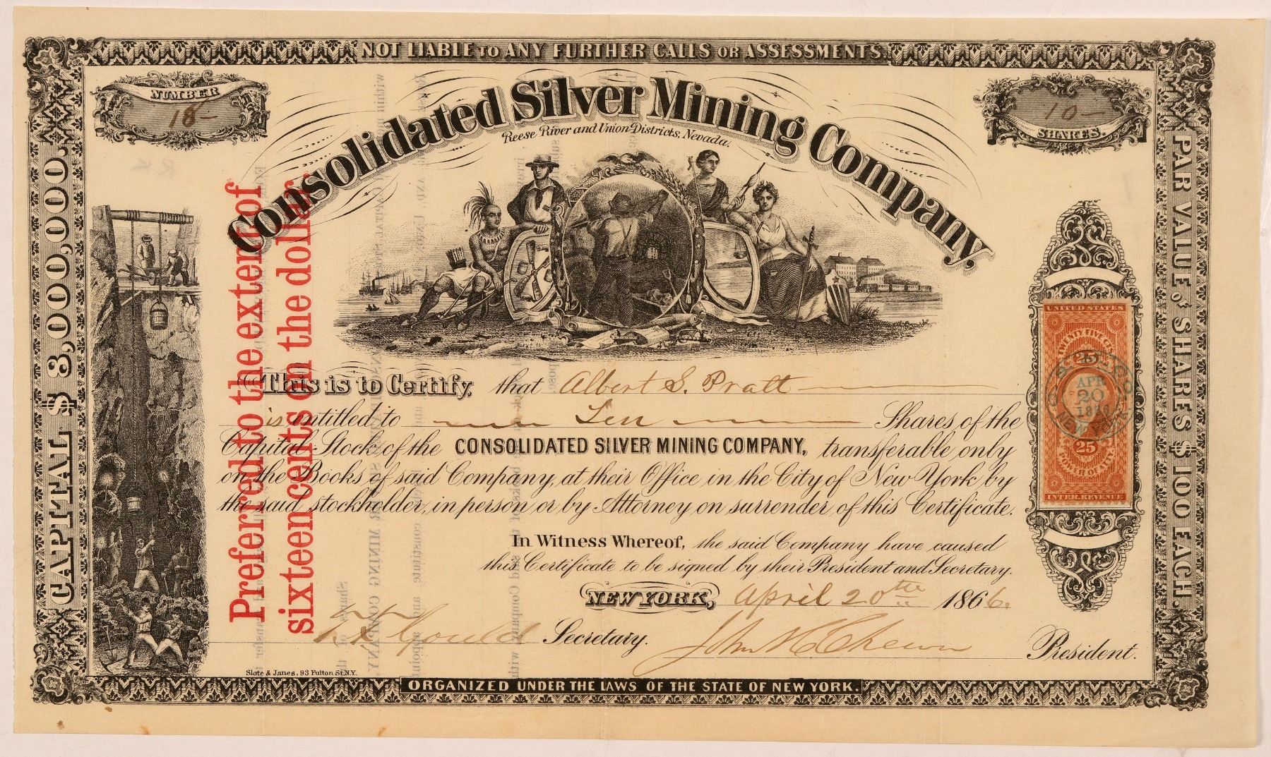 Reese River and Union Districts, Nevada (printed under title). Inc. in New York. No. 18, issued for 10 shares to Albert S. Pratt on April 20th, 1866 in New York. Signed by the president, John H (illegible) and secretary FF Gould. Not cancelled. Black border and print. Two vignettes: mine hoisting scene (left side) and allegorical vignette with settlers, Native Americans and miners (top center). Printed by Slote & Janes, NY. 25 cent IR stamp with tied cancel attached on the right. Folds, light wear. 7 x 12" No additional information located.