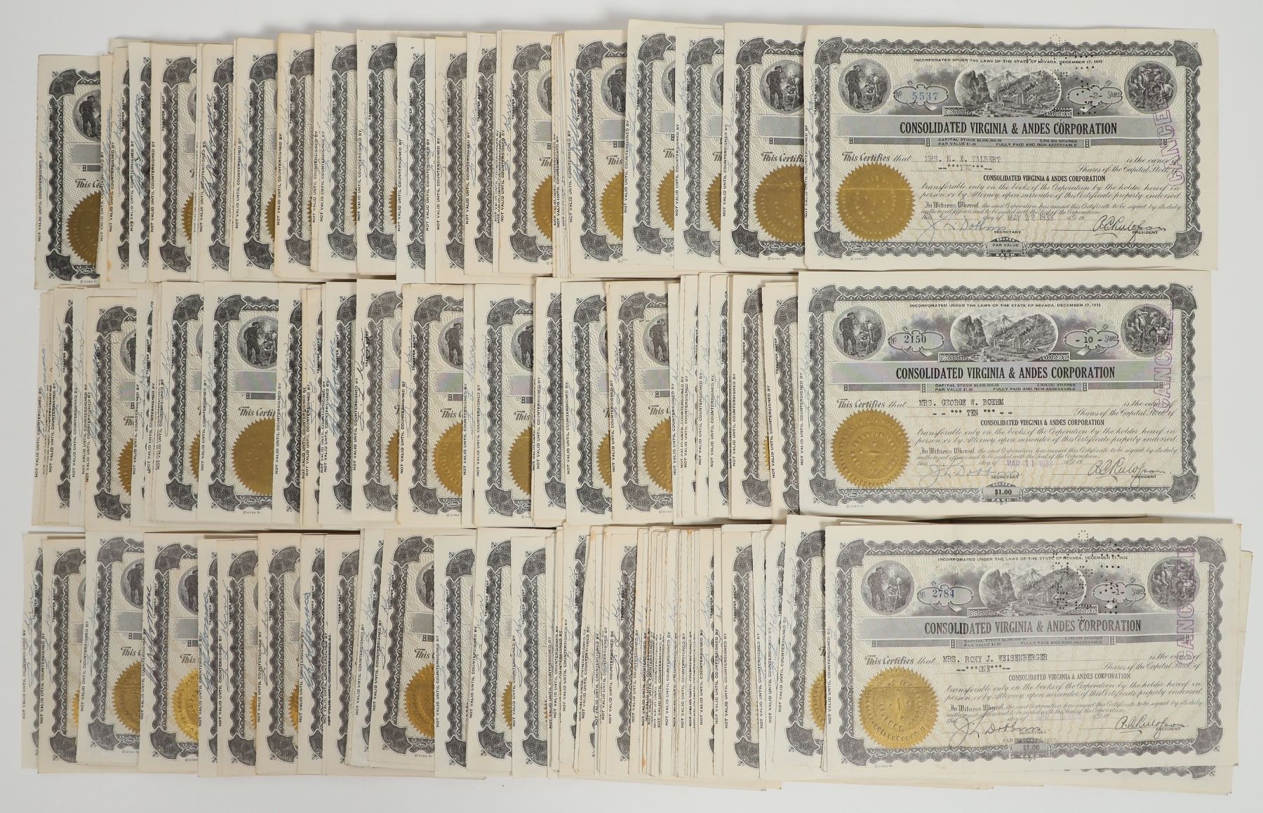 Group of approx. 320 stock certificates from the Consolidated Virginia & Andes Corporation, a mining corporation which operated in Virginia City, Nevada, all issued in 1933. Issued w/ embossed company seal, all cancelled using an ink stamp cancellation. Black ink with brown underprint, three mining vignettes, 9.75"x5.75". Fine condition; see photos for detail.