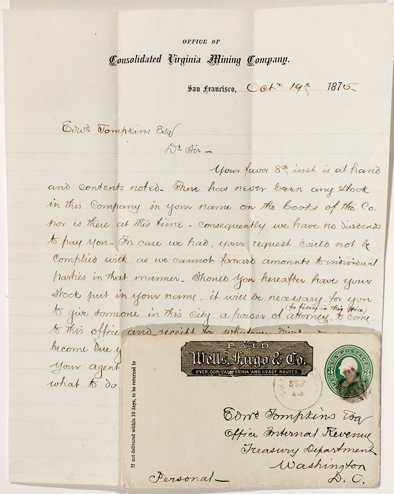 1875 This is a letter from the Con Virginia Main Offices in S.F. to one Edward Tompkins Esq. of the IRS/ Treasury Dept. in Washington D.C. The hand-written body of the letter (very legible) and states that Mr. Tompkins is not, and never was a stockholder, and therefore is not due any dividends. It continues to illuminate means to achieve such dividends, provided Mr. Tompkins follows the correct procedures. The cover is a Wells-Fargo, with postage and postmark affixed. Both pieces are in excellent condition. Located in Virginia City on the Comstock Lode, the Consolidated Virginia Mine was one of the top two producing mines on the Comstock, and by the time it’s neighbor and chief competitor, the California Mine merged with the company, it was the most important mine in Nevada’s history. Together, the two mines produced over $125 million in gold and silver. It also paid almost $75 million in dividends. The great names of the Comstock such as Mackay, Fair, Flood and O`Brien are all part of the Con Virginia history. - HKA#65195
