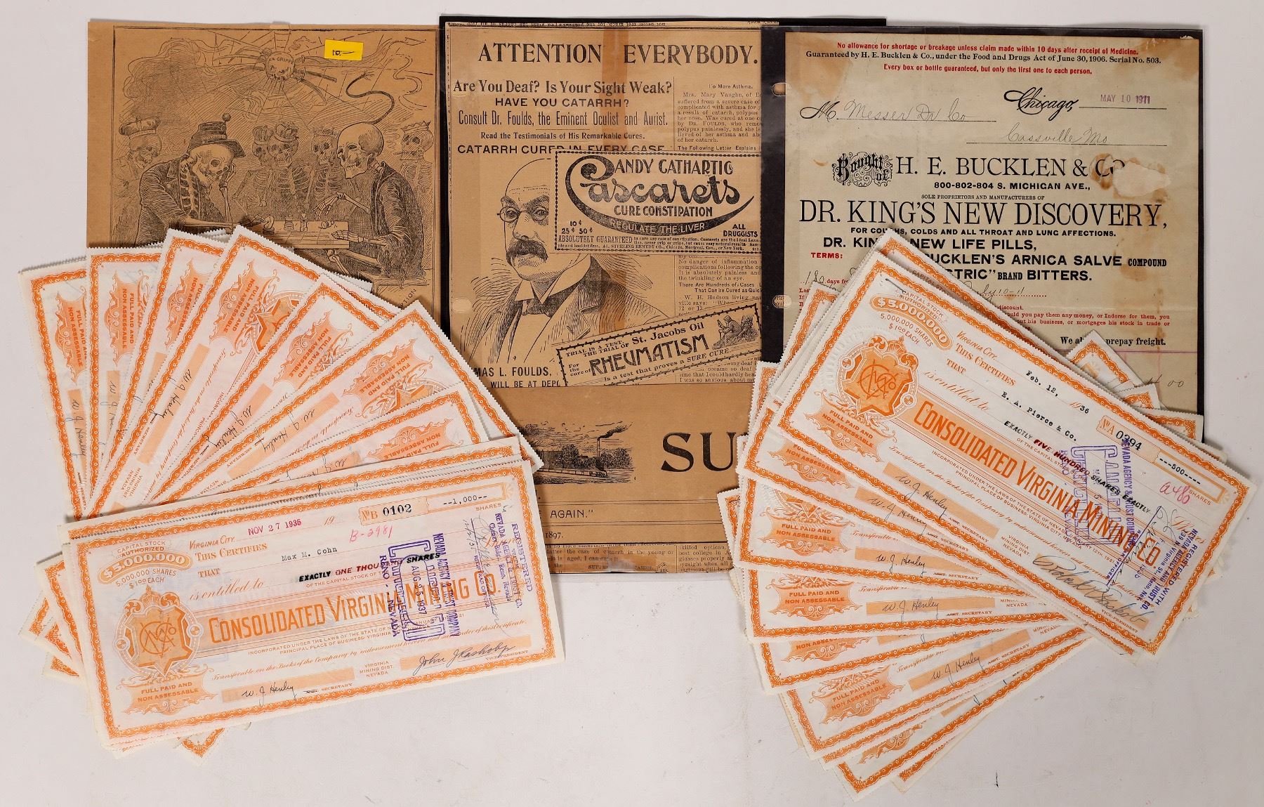 Lot of 22 Consolidated Virginia Mining Company stock certificates, issued and cancelled in the 1930s. Orange printing, 9 x 4 inches.
