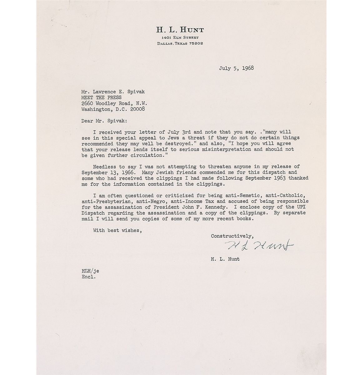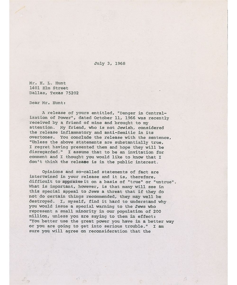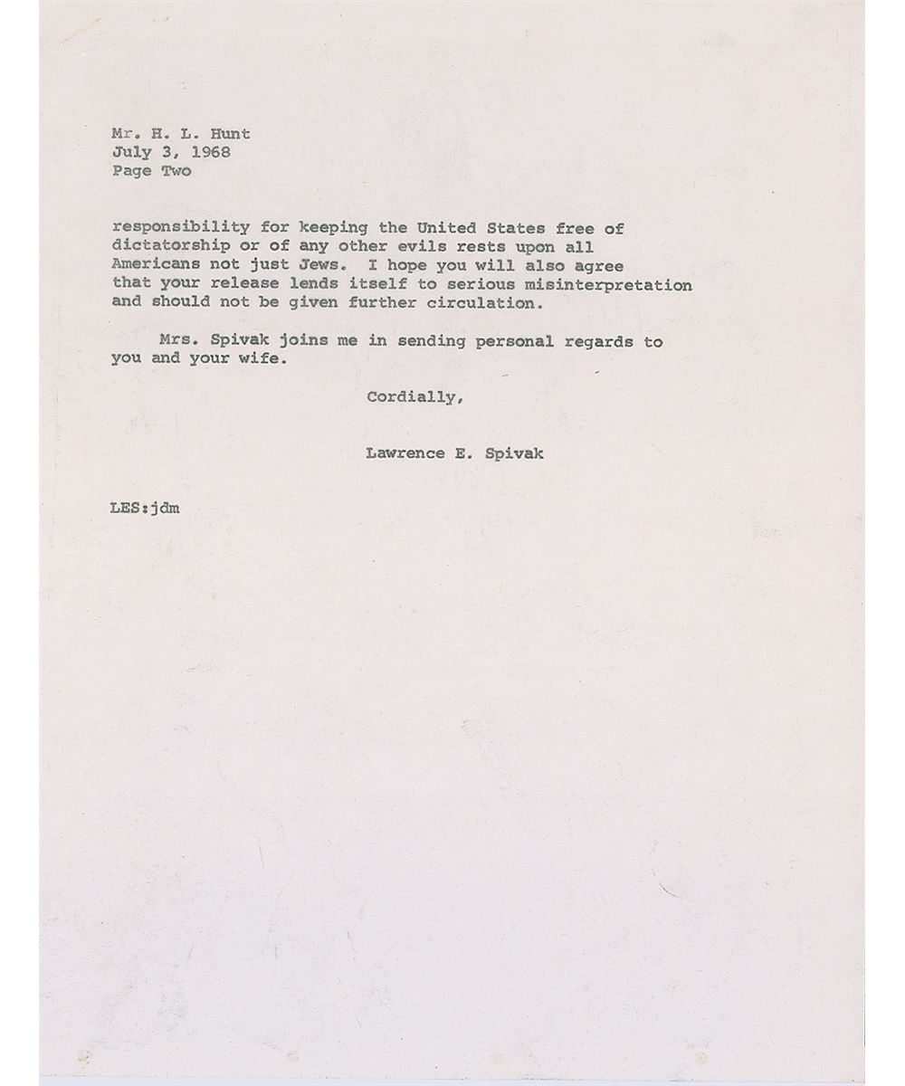 American oil tycoon (1889–1974) who built his oil dynasty by trading poker winnings for oil rights, eventually owning a vast majority of the East Texas Oil Field. TLS, one page, 8.5 x 11, personal letterhead, July 5, 1968. Letter to Lawrence E. Spivak of Meet the Press. In part: “I received your letter of July 3rd and note that you say, ‘many will see in this special appeal to Jews a threat if they do not do certain things recommended they may well be destroyed.’ And also, ‘I hope you will agree that your release lends itself to serious misinterpretation and should not be given further circulation.’ Needless to say, I was not attempting to threaten anyone in my release of September 13, 1966. Many Jewish friends commended me for this dispatch and some who had received the clippings I had made following September 1963 thanked me for the information contained in the clippings. I am often questioned or criticized for being anti-Semitic, anti-Catholic, anti-Presbytarian, anti-Negro, anti-Income Tax and accused of being responsible for the assassination of President John F. Kennedy. I enclose copy of the UPI Dispatch regarding the assassination.” In fine condition, with a few mild creases and staple holes to the upper left corner. Some conspiracy theories revolve around Hunt and a cabal of billionaires arranging the assassination so that LBJ could take power. An especially noteworthy letter, as Spivak was the founder and moderator of Meet the Press.