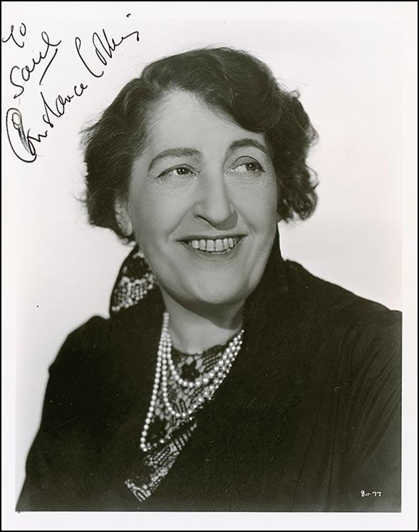 Vintage pearl-finish 8 x 10 double weight Clarence Sinclair Bull MGM publicity photo of Collier for the film Shadow of Doubt, signed and inscribed in fountain pen “To Saul, Constance Collier.” Reverse of photo bears collector’s stamp date of June 29, 1936, the date the signature was acquired, as well as a promotional caption affixed to reverse. In fine condition, with light brush to first name, and a light horizontal bend to lower portion of image. The Saul Goodman collection.