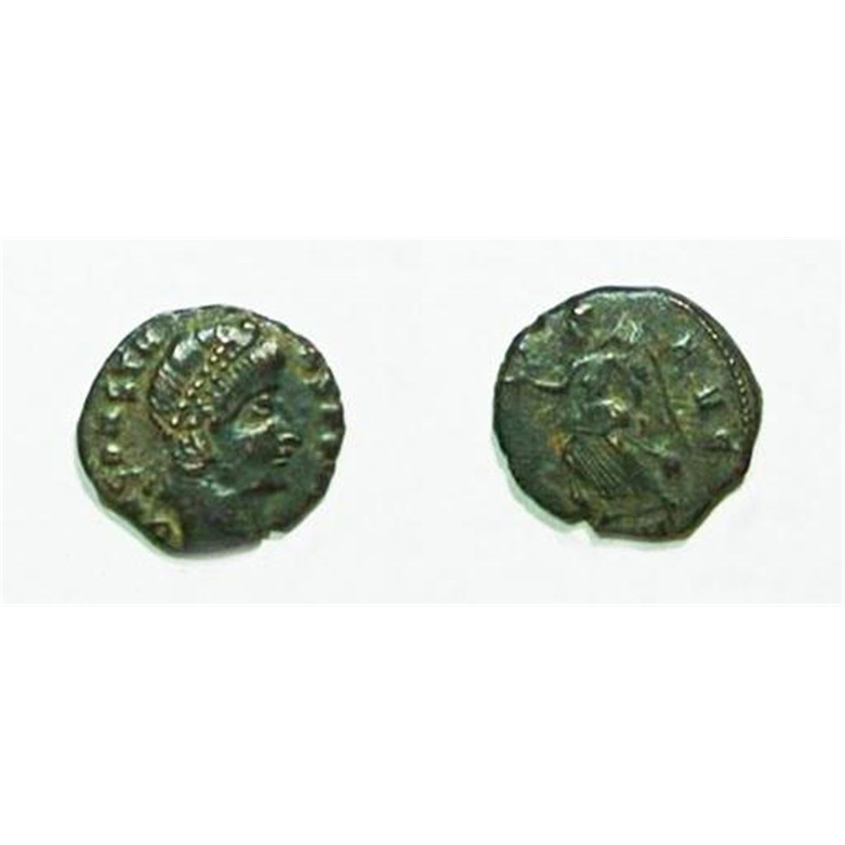 Constans Bronze roman coin. On obverse-CONSTANS PF AVG, diademed, draped and cuirassed bust right. On reverse-VICT AVG, victory advancing left, holding wreath and palm