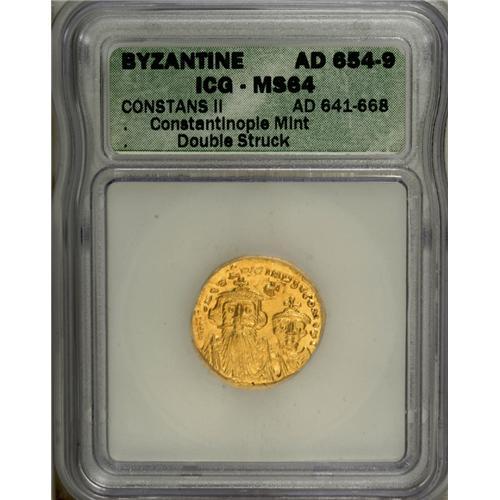 <B>Constans II.</B></I> 641-668. AV Solidus (20 mm). Constantinople, 654-659. Crowned facing busts of Constans and Constantine IV; cross above / Cross potent on three steps; S/CONOB. DOC 25f; SB 959. <B>MS64 ICG.</B></I><BR><BR><b>Shipping:</b> Coin/Currency (<a target="_blank" href="http://www.heritageauctions.com/common/shipping.php">view shipping information</a>)