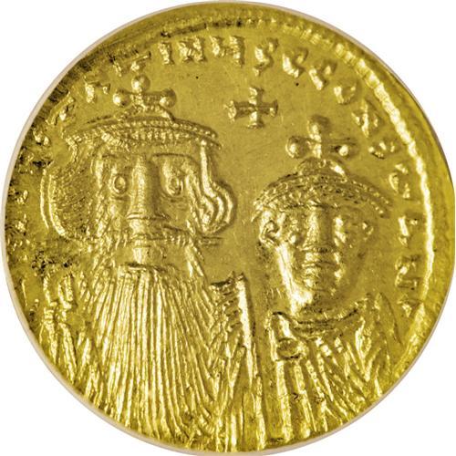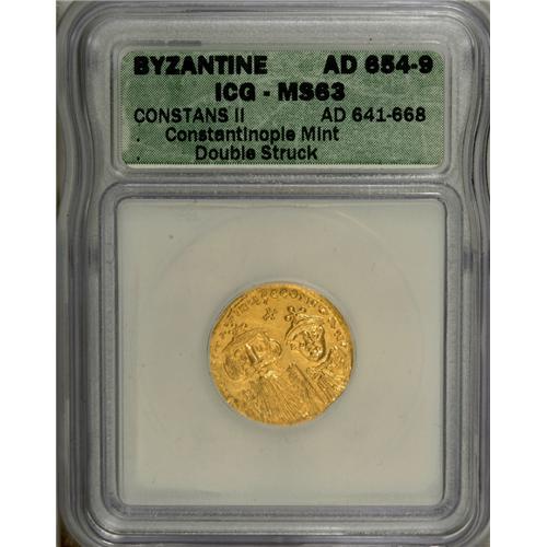 <B>Constans II.</B></I> 641-668. AV Solidus (21 mm). Constantinople, 654-659. Crowned facing busts of Constans and Constantine IV; cross above / Cross potent on three steps; Z(retrograde)/CONOB. DOC 25g; SB 959. <B>MS63 ICG.</B></I><BR><BR><b>Shipping:</b> Coin/Currency (<a target="_blank" href="http://www.heritageauctions.com/common/shipping.php">view shipping information</a>)