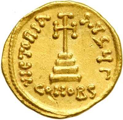Constans II, 641-668. Gold Solidus (4.49 g) minted at Constantinople. Crowned bust facing, holding globus cruciger. Reverse: Cross potent on three steps. D.O. 3; S. 940. Lightly brushed. About Extremely Fine.