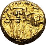 Constans II (641-668). Solidus of small module, Chartage, 662-668. Obv. Fragmentary legend; crowned facing busts of Constans, with long beard, and Constantine IV, beardless. Constans holding globus cruciger in right hand. Rev. Tall cross on three steps; to left and right, crowned, draped and beardless busts of Heraclius and Tiberius, each holding globus cruciger in right hand. D.O. 126. MIB 73. Sear 1044. AU. g. 4.34 mm. 11.00 R. Nearly EF. Impero Bizantino. D.O. 126. MIB 73. Sear 1044. AU. g. 4.34 mm. 11.00 R.