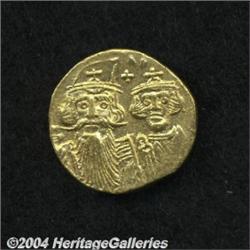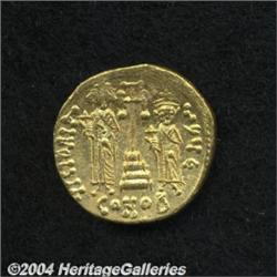 <B>Constans II.</B></I> A.D. 641-668. AV solidus (19 mm, 4.28 g). Constantinople, ca. A.D. 661-663. Facing busts of Constans, wearing plumed helmet, and Constantine, crowned; cross between their heads / Cross potent on three steps between Heraclius and Tiberius, each holding globus cruciger; E/CONOB. DOC 30 var. (officina not listed); SB 964. XF, clipped. <BR><I>From the Geneva Collection.</B></I> <BR><BR><B>Important notice:</B> Heritage usually auctions material at the rate of 200-250 lots per hour. On some occasions eBay Live bid software or the Internet may not be able to keep up with the pace of the auction. We recommend placing a realistic absentee bid now as insurance to avoid disappointment. Occasionally the auctioneer may eliminate or reject an eBay Live bid, and the auctioneer may also reopen a lot after the close of the eBay live bidding (usually because we missed an audience bid), and may reject your bid even if it shows you as the winning bidder. By bidding via eBay Live, you agree that Heritage may award the lot to another bidder at its sole discretion under the circumstances described above or any other reasonable circumstances. Since eBay bids are not shown to us until we open the lot on the floor, we treat those bids just like floor bids. In most cases the floor responds before the eBay bid is presented to us, due to Internet lag time, so for consistency we have made it a policy that floor bids are always considered first over tie eBay live bids. Also please note that all Heritage lots purchased through eBay Live carry a 20% Buyer's Premium. Please make sure you read the Terms and Conditions before you bid.