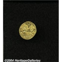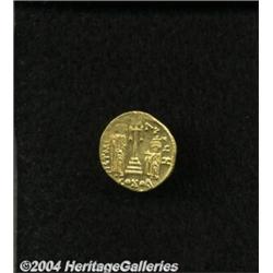 <B>Constans II.</B></I> A.D. 641-668. AV solidus (19 mm, 4.48 g). Constantinople, ca. A.D. 661-663. Facing busts of Constans, wearing plumed helmet, and Constantine, crowned; cross between their heads / Cross potent on three steps between Heraclius and Tiberius, each holding globus cruciger; H/CONOB. DOC 30g; SB 964. Choice XF, some flatness. <BR><I>From the Geneva Collection.</B></I> <BR><BR><B>Important notice:</B> Heritage usually auctions material at the rate of 200-250 lots per hour. On some occasions eBay Live bid software or the Internet may not be able to keep up with the pace of the auction. We recommend placing a realistic absentee bid now as insurance to avoid disappointment. Occasionally the auctioneer may eliminate or reject an eBay Live bid, and the auctioneer may also reopen a lot after the close of the eBay live bidding (usually because we missed an audience bid), and may reject your bid even if it shows you as the winning bidder. By bidding via eBay Live, you agree that Heritage may award the lot to another bidder at its sole discretion under the circumstances described above or any other reasonable circumstances. Since eBay bids are not shown to us until we open the lot on the floor, we treat those bids just like floor bids. In most cases the floor responds before the eBay bid is presented to us, due to Internet lag time, so for consistency we have made it a policy that floor bids are always considered first over tie eBay live bids. Also please note that all Heritage lots purchased through eBay Live carry a 20% Buyer's Premium. Please make sure you read the Terms and Conditions before you bid.
