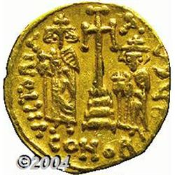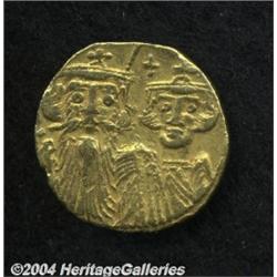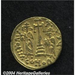 <B>Constans II.</B></I> A.D. 641-668. AV solidus (19 mm, 4.36 g). Constantinople, ca. A.D. 661-663. Facing busts of Constans, wearing plumed helmet, and Constantine, crowned; cross between their heads / Cross potent on three steps between Heraclius and Tiberius, each holding globus cruciger; ?/CONOB. Cf. DOC 30; SB 964. VF, clipped. <BR><I>From the Geneva Collection.</B></I> <BR><BR><B>Important notice:</B> Heritage usually auctions material at the rate of 200-250 lots per hour. On some occasions eBay Live bid software or the Internet may not be able to keep up with the pace of the auction. We recommend placing a realistic absentee bid now as insurance to avoid disappointment. Occasionally the auctioneer may eliminate or reject an eBay Live bid, and the auctioneer may also reopen a lot after the close of the eBay live bidding (usually because we missed an audience bid), and may reject your bid even if it shows you as the winning bidder. By bidding via eBay Live, you agree that Heritage may award the lot to another bidder at its sole discretion under the circumstances described above or any other reasonable circumstances. Since eBay bids are not shown to us until we open the lot on the floor, we treat those bids just like floor bids. In most cases the floor responds before the eBay bid is presented to us, due to Internet lag time, so for consistency we have made it a policy that floor bids are always considered first over tie eBay live bids. Also please note that all Heritage lots purchased through eBay Live carry a 20% Buyer's Premium. Please make sure you read the Terms and Conditions before you bid.