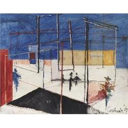 Constant (attributed to Constant Anton Nieuwenhuys, Dutch, b. 1920), “New Babylon”, c. 1969; watercolor with pastel/paper, 24” x 30.5”, signed and dated; label verso. Constant was an abstract expressionist painter who became a member of the Surrealist group in 1947, and then later the Cobra group. He studied in Amsterdam in the late 1930s and early 1940s. His work from the mid 1940s was influenced by Cubism and German Expressionism. From 1956-1974, he executed a series of works called New Babylon , which was a response to what he saw as the increasingly banal conditions of everyday life.