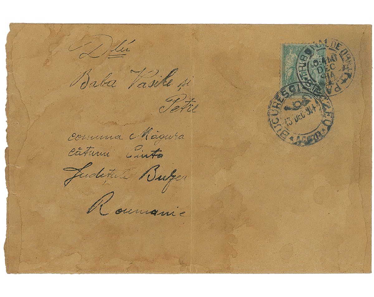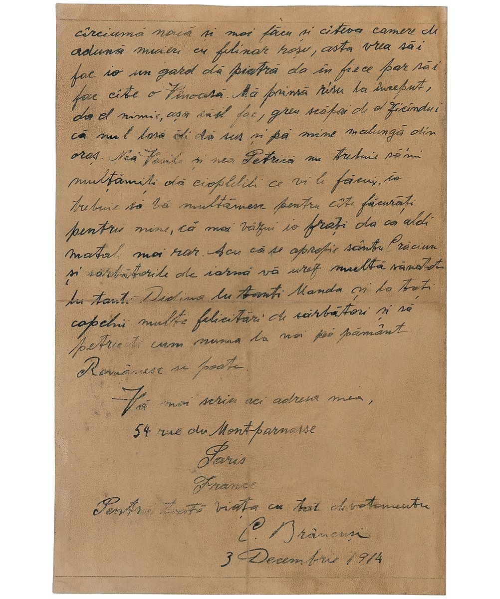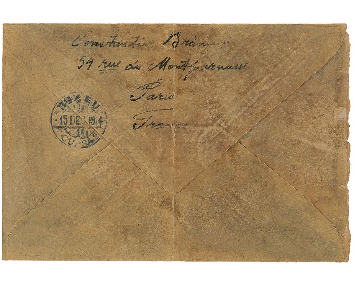 Pioneering Romanian sculptor (1876–1957) whose art emphasizes clean geometrical lines that balance forms inherent in his materials with the symbolic allusions of representational art. ALS in Romanian, signed “C. Brancusi,” four pages on two adjoining sheets, 5 x 7.75, July 3, 1914. Letter to his uncles, Vasile and Petrica. Brancusi describes his new flat in Paris and recalls a disappointing visit to Bucharest where he encountered an old friend who refused to even acknowledge him, although he had once helped him sell a statue. He continues to report on other aspects of his life and how dearly he misses his home country. Intersecting folds (vertical fold passing through a first letter of the signature), uniform toning, and partial separations to adjoining folds, otherwise fine condition. Accompanied by the original mailing envelope, addressed in his own hand, incorporating his full name in the return address area on the flap, “Constantin Brancusi.” This letter represents an important time and place in Brancusi's life—after studying at the Bucharest School of Fine Arts, he moved to Paris in 1903 and became involved with the growing community of artists and intellectuals, including a brief period of employment at Auguste Rodin's workshop. By the time of this letter, Brancusi had refined his revolutionary style and his work had garnered international acclaim—thanks, in part, to his inclusion in the famous 1913 Armory Show, the first modern art exhibition in the United States. A rare and lengthy letter by this immensely influential modern sculptor.