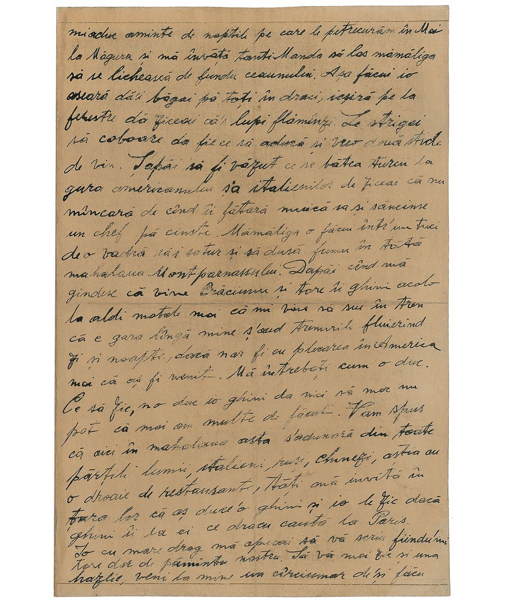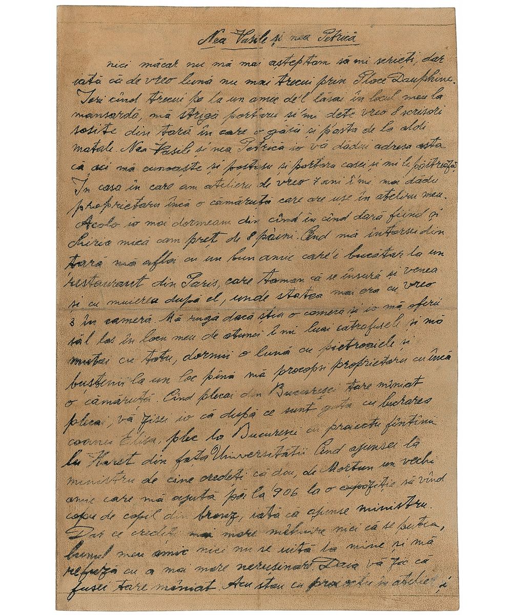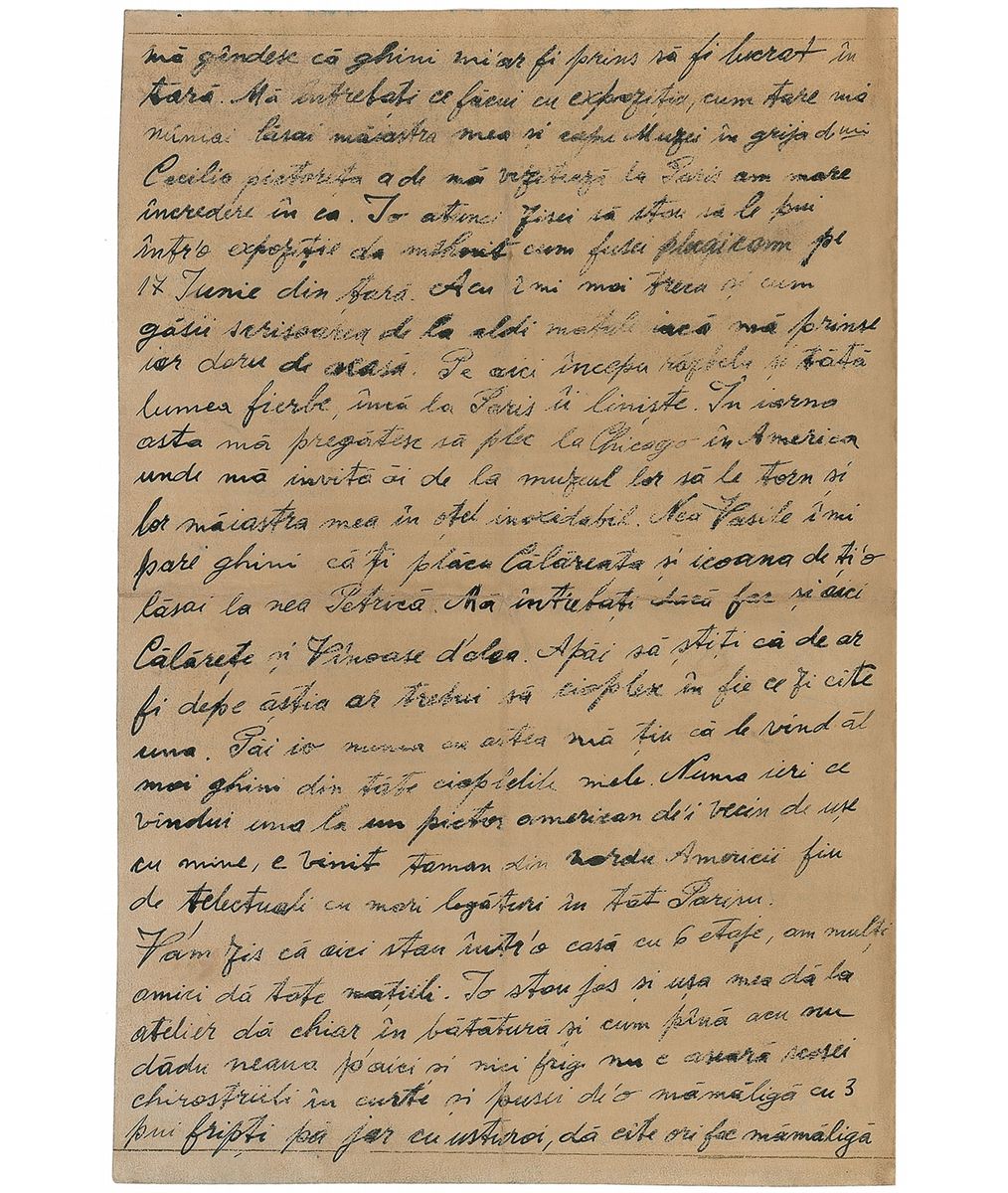Pioneering Romanian sculptor (1876–1957) whose art emphasizes clean geometrical lines that balance forms inherent in his materials with the symbolic allusions of representational art. ALS in Romanian, signed “C. Brancusi,” four pages on two adjoining sheets, 5 x 7.75, July 3, 1914. Letter to his uncles, Vasile and Petrica. Brancusi describes his new flat in Paris and recalls a disappointing visit to Bucharest where he encountered an old friend who refused to even acknowledge him, although he had once helped him sell a statue. He continues to report on other aspects of his life and how dearly he misses his home country. Intersecting folds (vertical fold passing through a first letter of the signature), uniform toning, and partial separations to adjoining folds, otherwise fine condition. Accompanied by the original mailing envelope, addressed in his own hand, incorporating his full name in the return address area on the flap, “Constantin Brancusi.” This letter represents an important time and place in Brancusi's life—after studying at the Bucharest School of Fine Arts, he moved to Paris in 1903 and became involved with the growing community of artists and intellectuals, including a brief period of employment at Auguste Rodin's workshop. By the time of this letter, Brancusi had refined his revolutionary style and his work had garnered international acclaim—thanks, in part, to his inclusion in the famous 1913 Armory Show, the first modern art exhibition in the United States. A rare and lengthy letter by this immensely influential modern sculptor.