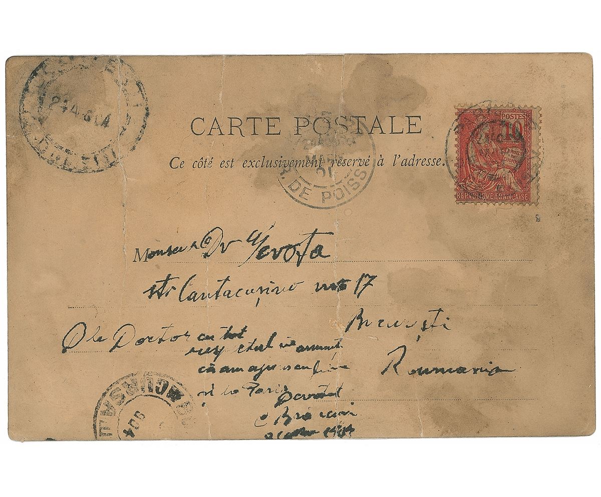 Pioneering Romanian sculptor (1876–1957) whose art emphasizes clean geometrical lines that balance forms inherent in his materials with the symbolic allusions of representational art. ANS in French, signed twice, “C. Brancusi,” one page on a 5.5 x 3.5 postcard depicting the Saint-Jacques Tower in Paris, circa 1904–1905. Postcard to Dimitrie Gerota, his former anatomy teacher at the Bucharest School of Fine Arts, informing him of his new address. Brancusi signs at both the conclusion of his note and on the front of the card, where he pens his new address: “C. Brancusi, 10 Place de la Bourse, Paris.” Several professionally repaired vertical tears and folds, and heavy overall soiling, otherwise very good condition.