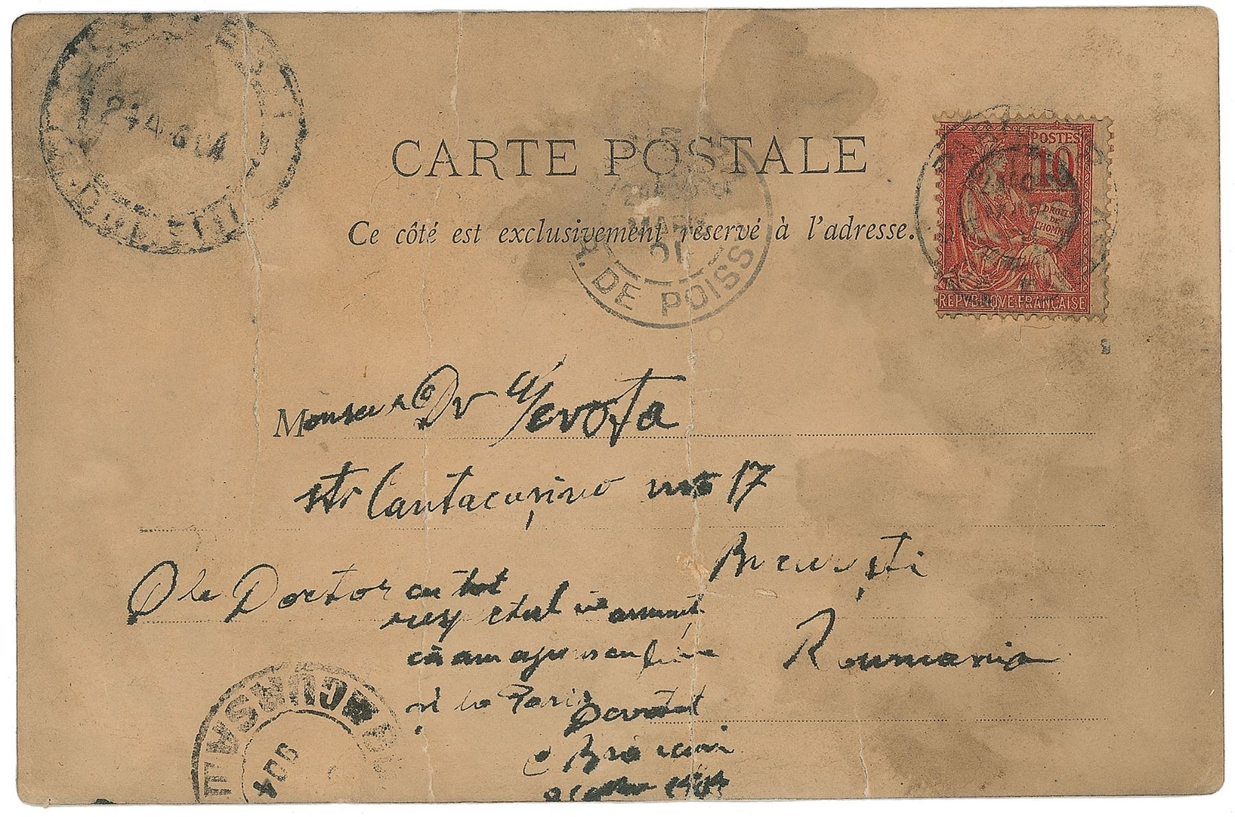 Pioneering Romanian sculptor (1876–1957) whose art emphasizes clean geometrical lines that balance forms inherent in his materials with the symbolic allusions of representational art. ANS in French, signed twice, "C. Brancusi," one page on a 5.5 x 3.5 postcard depicting the Saint-Jacques Tower in Paris, circa 1904-1905. Postcard to Dimitrie Gerota, his former anatomy teacher at the Bucharest School of Fine Arts, informing him of his new address. Brancusi signs at both the conclusion of his note and on the front of the card, where he pens his new address: "C. Brancusi, 10 Place de la Bourse, Paris." Several professionally repaired vertical tears and folds, and heavy overall soiling, otherwise very good condition.