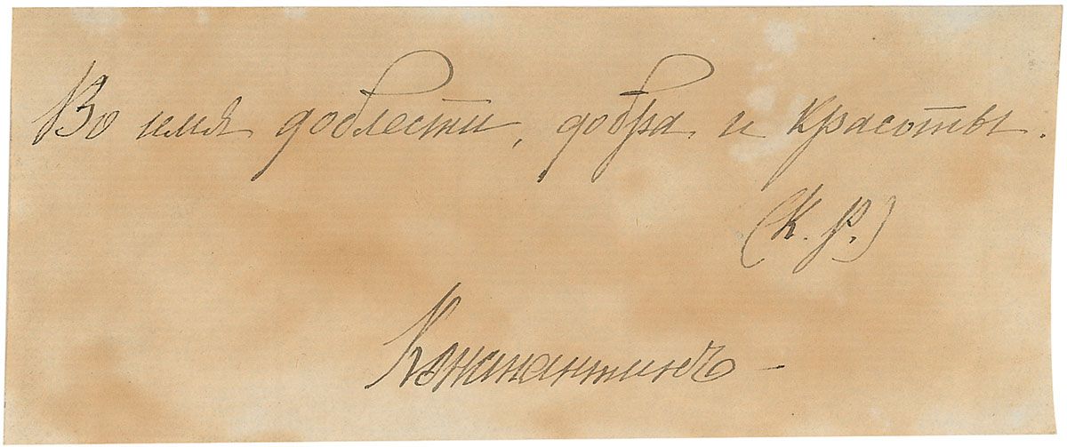 Grandson of Emperor Nicholas I of Russia, poet, and playwright (1858–1915). AQS in Russian on an off-white 6.5 x 2.75 sheet. Constantinovich writes, in full (translated): “In the name of glory, kindness and beauty, (K. R.), Constantin.” In very good condition, with moderate overall toning and soiling.