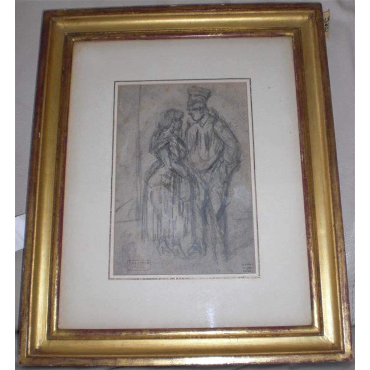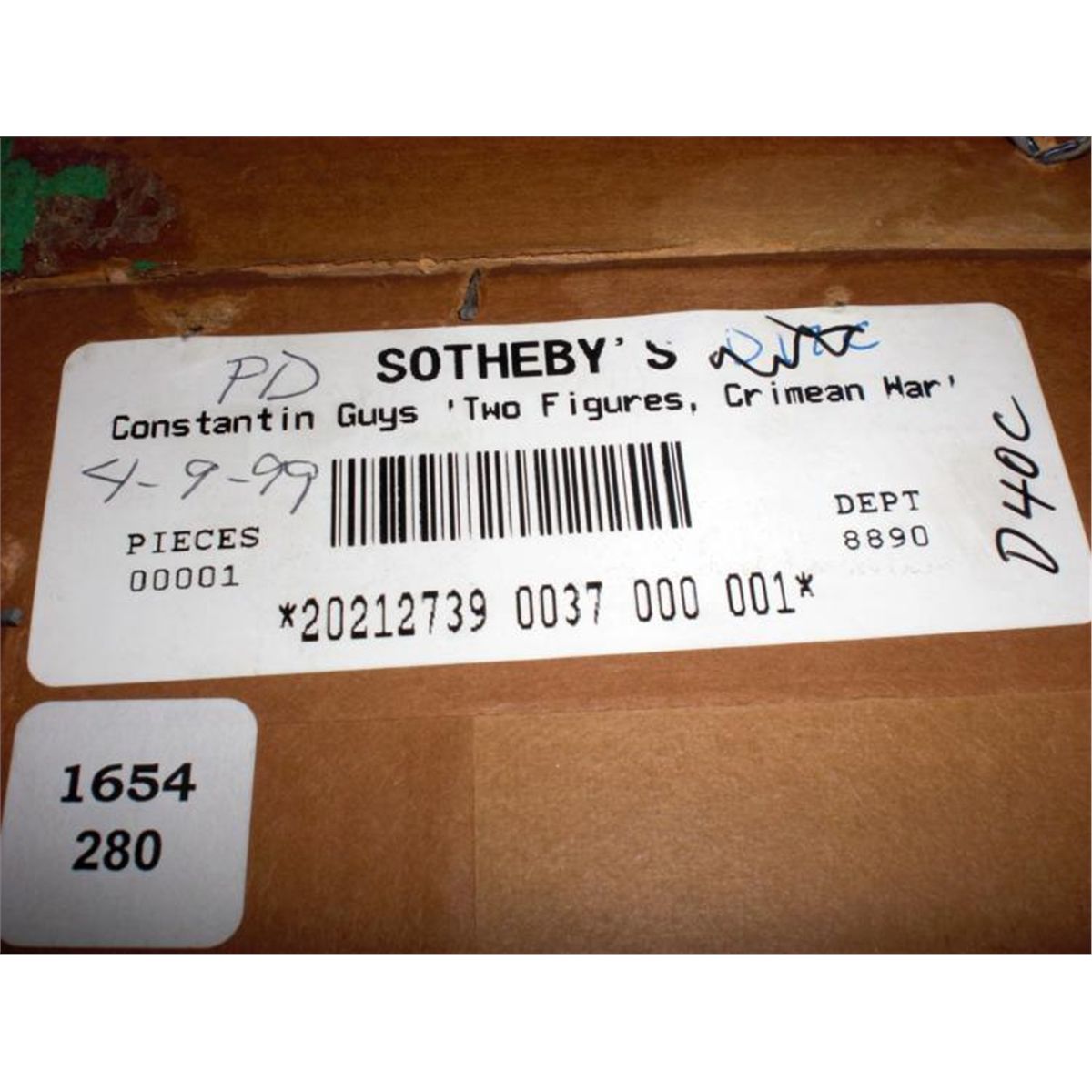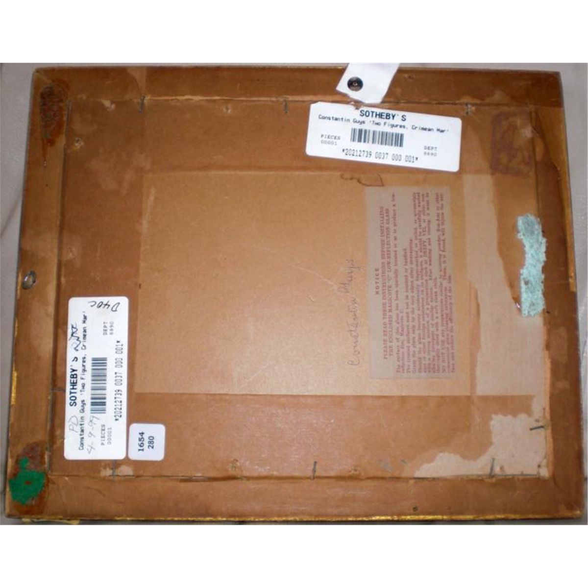 This original artwork portrays two figures from the Crimean War. The artist was a war correspondent, which gives this image a more personal sense of realism. It was last sold on auction at Sotheby's. * Artist: Constantin Guys Title: Crimean War, Two Figures Image Size: Approximately 11 7/8 x 14 1/8 inches Media: Pencil drawing Image size: Approximately 5 x 7 1/2 inches Framing: In gold painted wood frame Frame size: 11 3/4 x 14 1/2 inches Year: 1899 Condition: Excellent Sotheby's Catalog # 202127390037000001, with label included Biography:Constantin Guys (1802 - 1892) was a French watercolorist and illustrator for newspapers and magazines.His subjects focused on ordinary life during the second French Empire. The noted French poet Charles Baudelaire spoke highly of Guys, and called him the "painter of modern life." He painted in a realism that captured personality as well. His work can be found in many museums and private collections worldwide, including the Art Institute of Chicago, The Harvard University Art Museum, and the Louvre in Paris. *