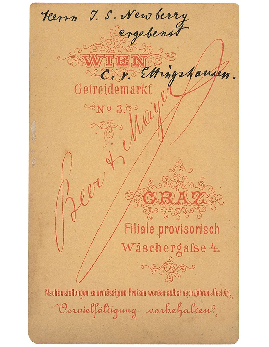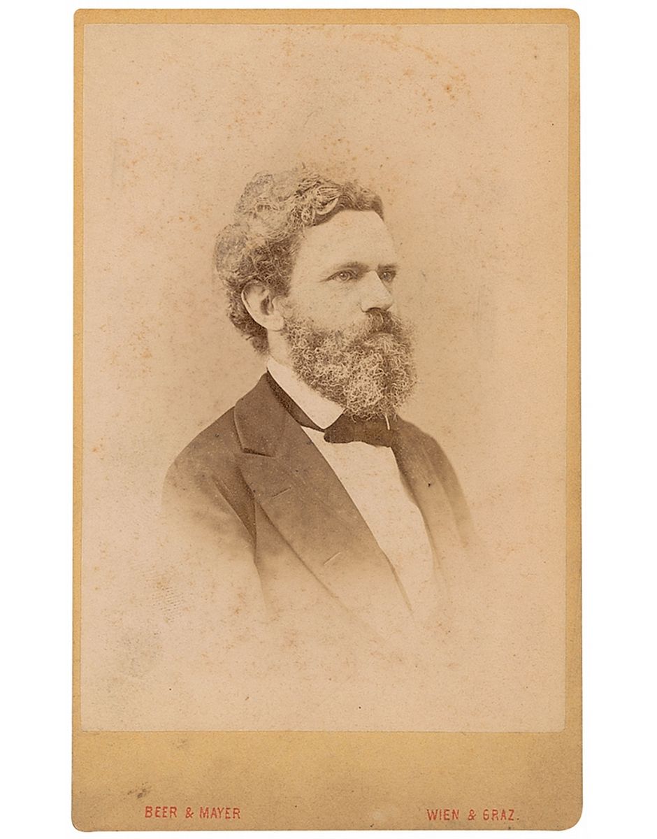 Austrian geologist and botanist (1826–1897). Original 2.5 x 4 carte-de-visite bust portrait by Beer & Mayer of Vienna, signed and inscribed to a fellow geologist on the reverse black ink, “Herrn J. S. Newberry, ergebenst, C. v. Ettingshausen.” Scattered foxing and soiling to the image and reverse, otherwise fine condition.