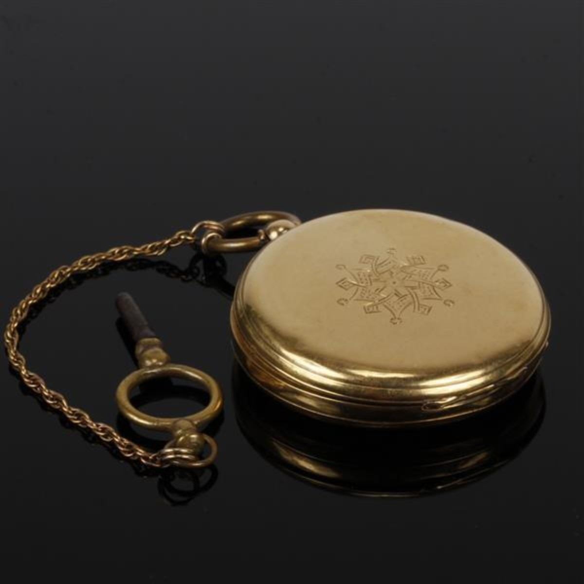 Constantine Geneve Cylindre Huit Rubis 18K gold case, open enameled face, Roman numerals, key wind pocket watch with key & chain. Ticks when wound.