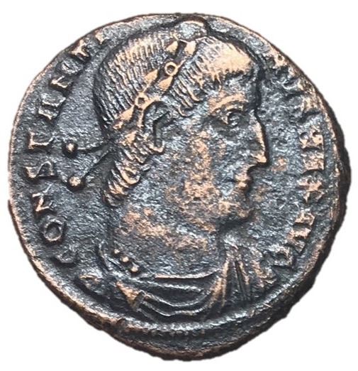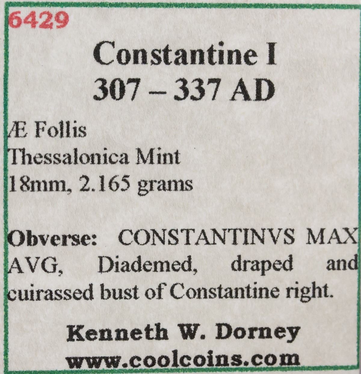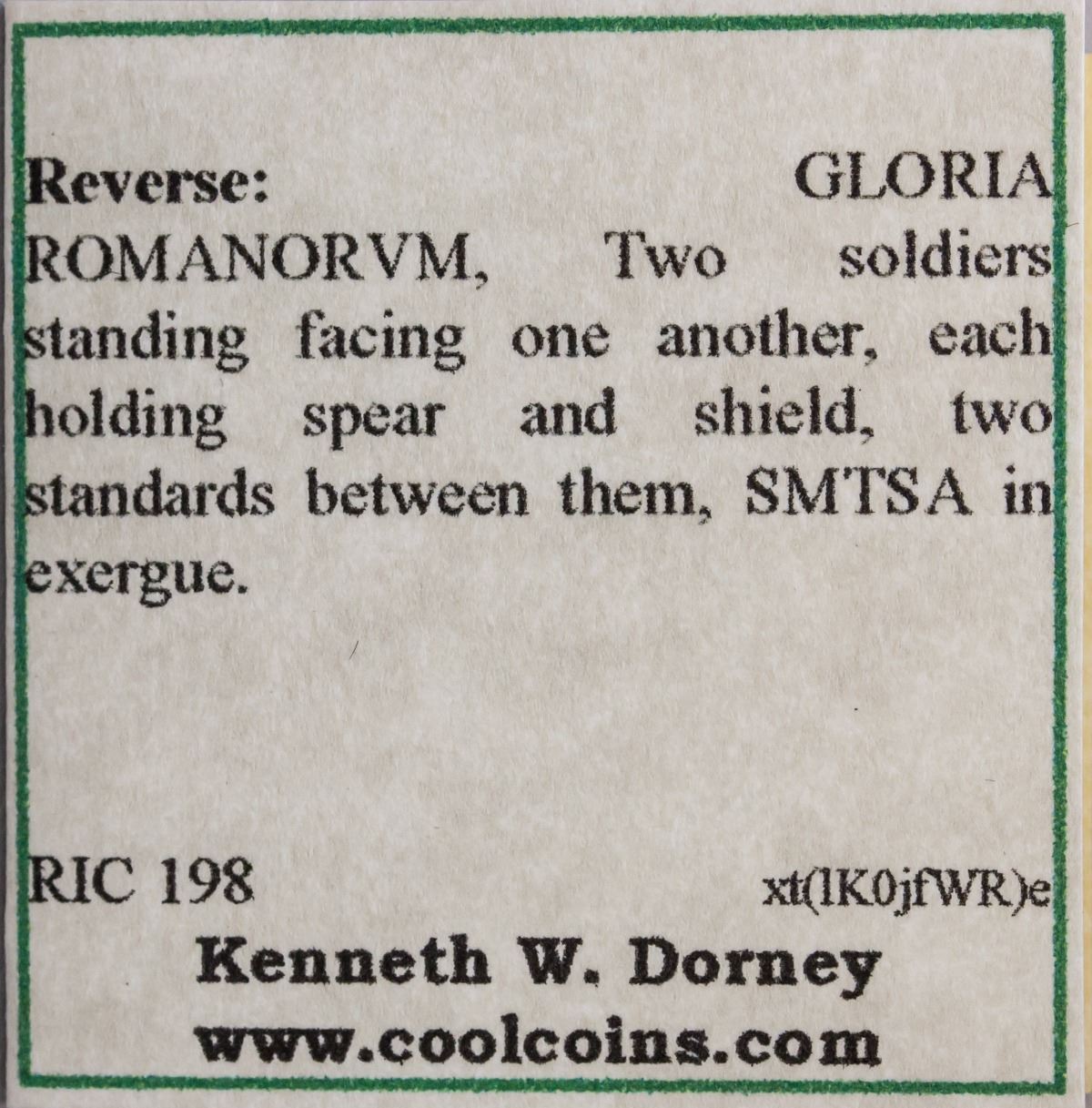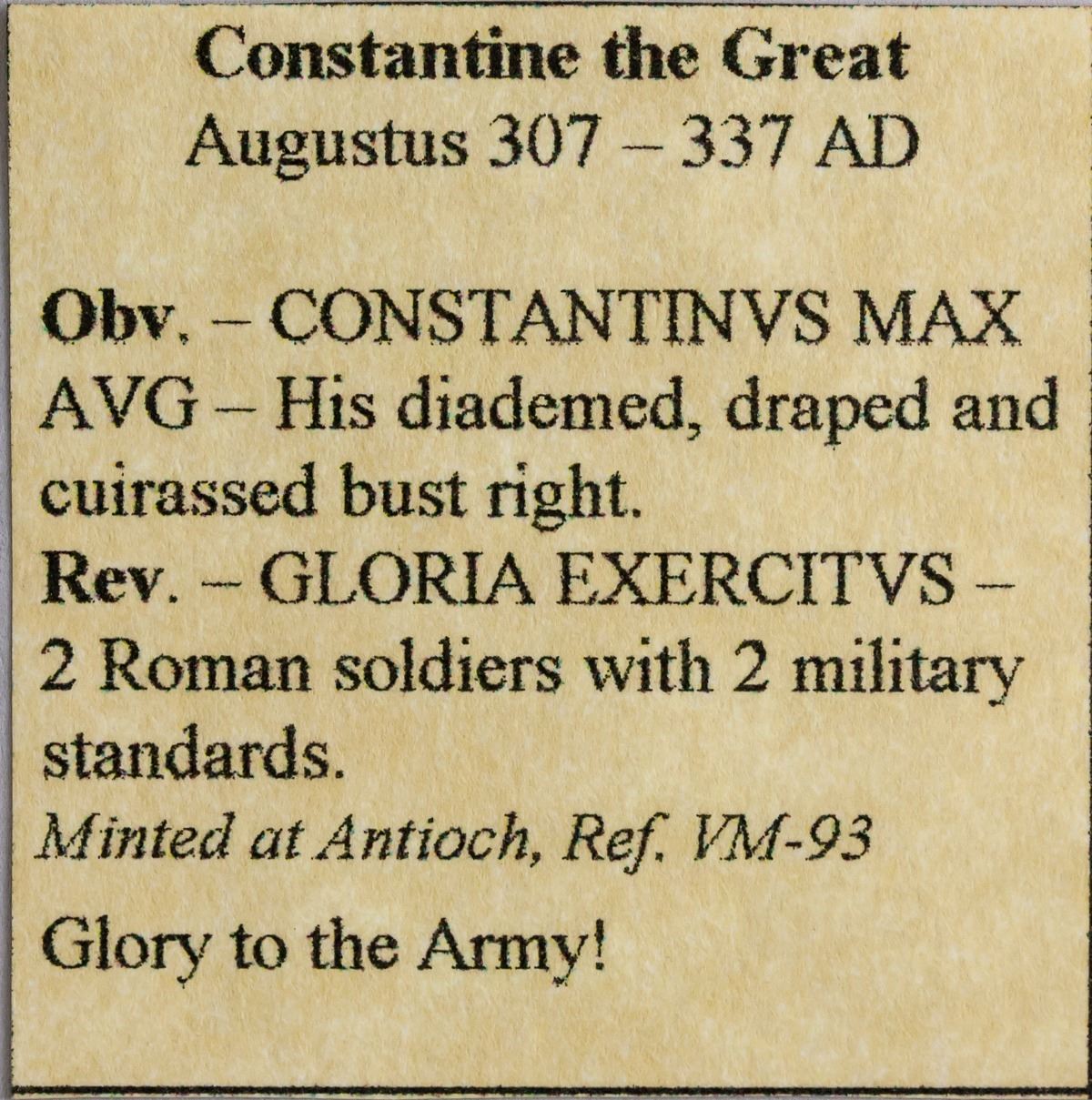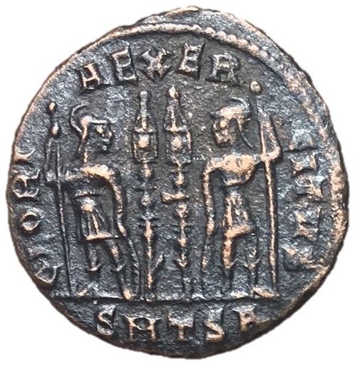 Constantine I, 307 - 337 A.D. AE Follis, Thessalonica Mint, 18mm, 2.16 grams. Obverse: CONSTANTINVS MAX AVG, Laureate bust of Constantine right. Reverse: GLORIA ROMANORVM, Two soldiers standing facing one another, each holding a spear and shield, two standards between them, SMTSA in exergue. RIC 198