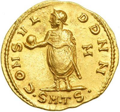 The collapse of Diocletian's carefully constructed tetrarchic system in 307 prompted the senior emperor Galerius to call for a conference at Carnuntum in November of 308, at which the various claimants to imperial power were supposed to restore an orderly division of the empire. Constantine and Maximinus II Daia were each demoted from the rank of Augustus to that of Caesar, a proposition they found intolerable. To mollify them, Galerius proposed in 309 that they each receive the title "Son of the Augusti" (Filius Augustorum). Not surprisingly, both men rejected the meaningless epithet and resumed calling themselves Augusti. However, eastern mints under Galerius' control briefly included the title in the inscriptions of what are today rare folles and aurei. An additional feature of interest on this aureus is the small symbol in the right field, apparently a mark of value indicating the coin was intended to be struck at sixty to the Roman pound (approximately 5.4 grams).