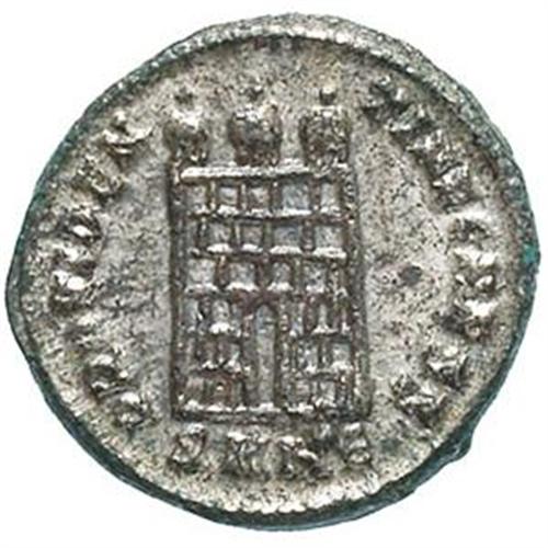 Roman Empire Coins. Constantine II (337-340). AE 18 mm, Nicomedia. D/ DN FL CL CONSTANTINVS NOB C. Busto laureato, con manto imperiale, a sinistra. R/ PROVIDENTIAE CAESS. Porta d'accampamento sormontata da tre torrette. In esergo: SMN?. gr. 3.70 AE. Piena argentatura. qFDC.