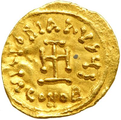 Constantine IV, 668-685. Gold Tremissis (1.42 g) minted at Constantinople. Diademed, cuirassed and draped bust right of Constantine IV. Reverse: Cross potent on base. D.O. 17; S. 1162. Wavy flan. About Extremely Fine.