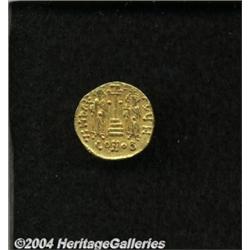 <B>Constantine IV.</B></I> A.D. 668-685. AV solidus (20 mm, 4.39 g). Constantinople, A.D. 668-673. Helmeted and cuirassed bust facing slightly right, holding spear / Cross potent on three steps between standing figures of Heraclius and Tiberius; H/CONOB. DOC 6g; SB 1153. XF. <BR><I>From the Geneva Collection.</B></I> <BR><BR><B>Important notice:</B> Heritage usually auctions material at the rate of 200-250 lots per hour. On some occasions eBay Live bid software or the Internet may not be able to keep up with the pace of the auction. We recommend placing a realistic absentee bid now as insurance to avoid disappointment. Occasionally the auctioneer may eliminate or reject an eBay Live bid, and the auctioneer may also reopen a lot after the close of the eBay live bidding (usually because we missed an audience bid), and may reject your bid even if it shows you as the winning bidder. By bidding via eBay Live, you agree that Heritage may award the lot to another bidder at its sole discretion under the circumstances described above or any other reasonable circumstances. Since eBay bids are not shown to us until we open the lot on the floor, we treat those bids just like floor bids. In most cases the floor responds before the eBay bid is presented to us, due to Internet lag time, so for consistency we have made it a policy that floor bids are always considered first over tie eBay live bids. Also please note that all Heritage lots purchased through eBay Live carry a 20% Buyer's Premium. Please make sure you read the Terms and Conditions before you bid.