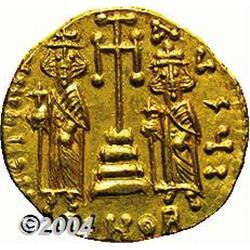 <B>Constantine IV.</B></I> A.D. 668-685. AV solidus (19 mm, 4.35 g). Constantinople, A.D. 674-681. Helmeted and cuirassed bust facing slightly right, holding spear and shield decorated with horseman spearing a fallen enemy / Cross potent on three steps between standing figures of Heraclius and Tiberius; I/CONOB. DOC 8e; SB 1154. XF, clear details. <BR><I>From the Geneva Collection.</B></I> <BR><BR><B>Important notice:</B> Heritage usually auctions material at the rate of 200-250 lots per hour. On some occasions eBay Live bid software or the Internet may not be able to keep up with the pace of the auction. We recommend placing a realistic absentee bid now as insurance to avoid disappointment. Occasionally the auctioneer may eliminate or reject an eBay Live bid, and the auctioneer may also reopen a lot after the close of the eBay live bidding (usually because we missed an audience bid), and may reject your bid even if it shows you as the winning bidder. By bidding via eBay Live, you agree that Heritage may award the lot to another bidder at its sole discretion under the circumstances described above or any other reasonable circumstances. Since eBay bids are not shown to us until we open the lot on the floor, we treat those bids just like floor bids. In most cases the floor responds before the eBay bid is presented to us, due to Internet lag time, so for consistency we have made it a policy that floor bids are always considered first over tie eBay live bids. Also please note that all Heritage lots purchased through eBay Live carry a 20% Buyer's Premium. Please make sure you read the Terms and Conditions before you bid.