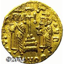 <B>Constantine IV.</B></I> A.D. 668-685. AV solidus (19 mm, 4.32 g). Constantinople, A.D. 674-681. Helmeted and cuirassed bust facing slightly right, holding spear and shield decorated with horseman spearing a fallen enemy / Cross potent on three steps between standing figures of Heraclius and Tiberius; B/CONOB. DOC 10 var. (officina not listed); SB 1156. VF.<BR><I>From the Geneva Collection.</B></I> <BR><BR><B>Important notice:</B> Heritage usually auctions material at the rate of 200-250 lots per hour. On some occasions eBay Live bid software or the Internet may not be able to keep up with the pace of the auction. We recommend placing a realistic absentee bid now as insurance to avoid disappointment. Occasionally the auctioneer may eliminate or reject an eBay Live bid, and the auctioneer may also reopen a lot after the close of the eBay live bidding (usually because we missed an audience bid), and may reject your bid even if it shows you as the winning bidder. By bidding via eBay Live, you agree that Heritage may award the lot to another bidder at its sole discretion under the circumstances described above or any other reasonable circumstances. Since eBay bids are not shown to us until we open the lot on the floor, we treat those bids just like floor bids. In most cases the floor responds before the eBay bid is presented to us, due to Internet lag time, so for consistency we have made it a policy that floor bids are always considered first over tie eBay live bids. Also please note that all Heritage lots purchased through eBay Live carry a 20% Buyer's Premium. Please make sure you read the Terms and Conditions before you bid.
