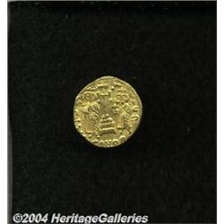<B>Constantine IV.</B></I> A.D. 668-685. AV solidus (19 mm, 4.32 g). Constantinople, A.D. 674-681. Helmeted and cuirassed bust facing slightly right, holding spear and shield decorated with horseman spearing a fallen enemy / Cross potent on three steps between standing figures of Heraclius and Tiberius; B/CONOB. DOC 10 var. (officina not listed); SB 1156. VF.<BR><I>From the Geneva Collection.</B></I> <BR><BR><B>Important notice:</B> Heritage usually auctions material at the rate of 200-250 lots per hour. On some occasions eBay Live bid software or the Internet may not be able to keep up with the pace of the auction. We recommend placing a realistic absentee bid now as insurance to avoid disappointment. Occasionally the auctioneer may eliminate or reject an eBay Live bid, and the auctioneer may also reopen a lot after the close of the eBay live bidding (usually because we missed an audience bid), and may reject your bid even if it shows you as the winning bidder. By bidding via eBay Live, you agree that Heritage may award the lot to another bidder at its sole discretion under the circumstances described above or any other reasonable circumstances. Since eBay bids are not shown to us until we open the lot on the floor, we treat those bids just like floor bids. In most cases the floor responds before the eBay bid is presented to us, due to Internet lag time, so for consistency we have made it a policy that floor bids are always considered first over tie eBay live bids. Also please note that all Heritage lots purchased through eBay Live carry a 20% Buyer's Premium. Please make sure you read the Terms and Conditions before you bid.